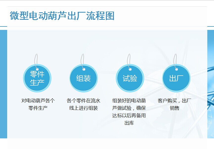 ?近期一些的用戶向我們做反饋,想要知道一些關(guān)于微型電動(dòng)葫蘆方面的知識(shí),更貼近的了解它的情況,今天我們就對(duì)電動(dòng)葫蘆的出廠流程做解密,為了便于用戶了解,我們將以圖片的形式給大家做展現(xiàn)。