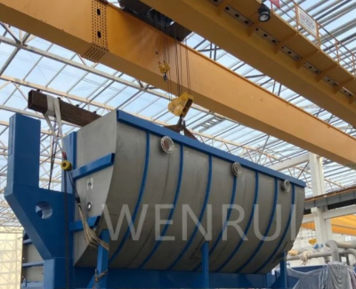 因為圓盤過濾機槽體部分重量達21噸、長度11米,要倒放運輸,組裝時需翻轉(zhuǎn)吊裝客戶廠房的行車為25噸單鉤,吊裝風(fēng)險較大,制作單位根據(jù)豐富的施工經(jīng)驗,結(jié)合現(xiàn)場條件做出施工預(yù)案,征得客戶同意后,在行車梁上增加了兩臺鋼絲繩電動葫蘆,利用提前附加的吊裝環(huán)實現(xiàn)了四點、兩線吊裝翻轉(zhuǎn),保證了所有槽體部件安全就位。